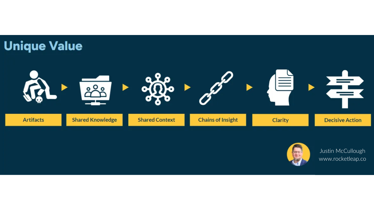 We need to see something valuable, an artifact, and we need to have shared knowledge so that we can get some visibility to the situation and establish shared context. From there, we can activate new ideas and what I call chains of insight that can only come from these pieces coming together. And from those chains of insight, we activate our imaginations and have clarity that leads to decisive action.