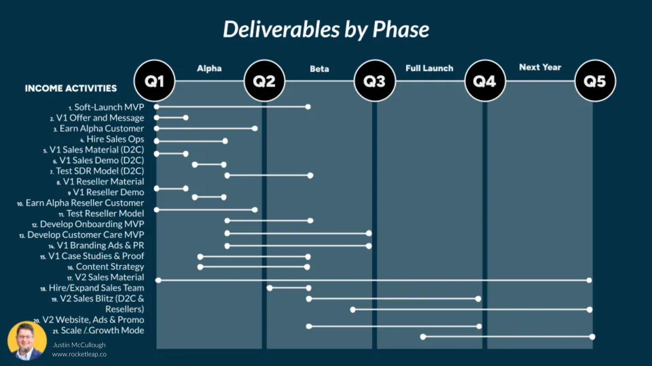 In this image below, there is a story being told about work to do over time and which departments (product, sales, marketing, support) are in focus. While its not being illustrated, there are dependencies that are practical. For example, you don’t want to hire a large sales force if you have no offering, no value prop, no understanding of how you sell and win customers. You need to get some things in place to support that phase of staffing and measuring their performance.