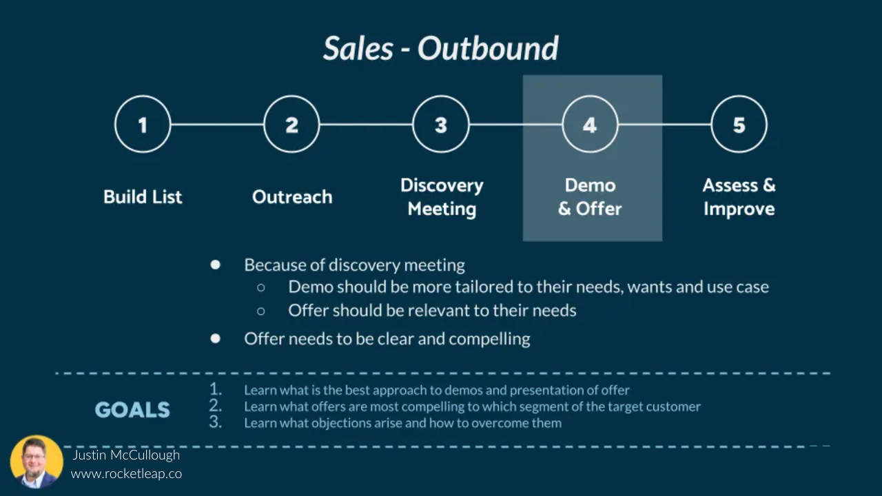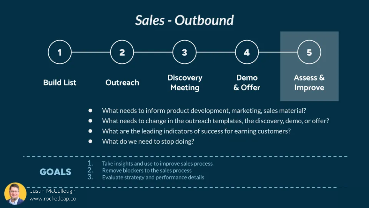 Do a retrospective at the end and assess how the process went, what you learned from the prospect, what the early outreach seems to be doing to shape who gets to a demo and so on.