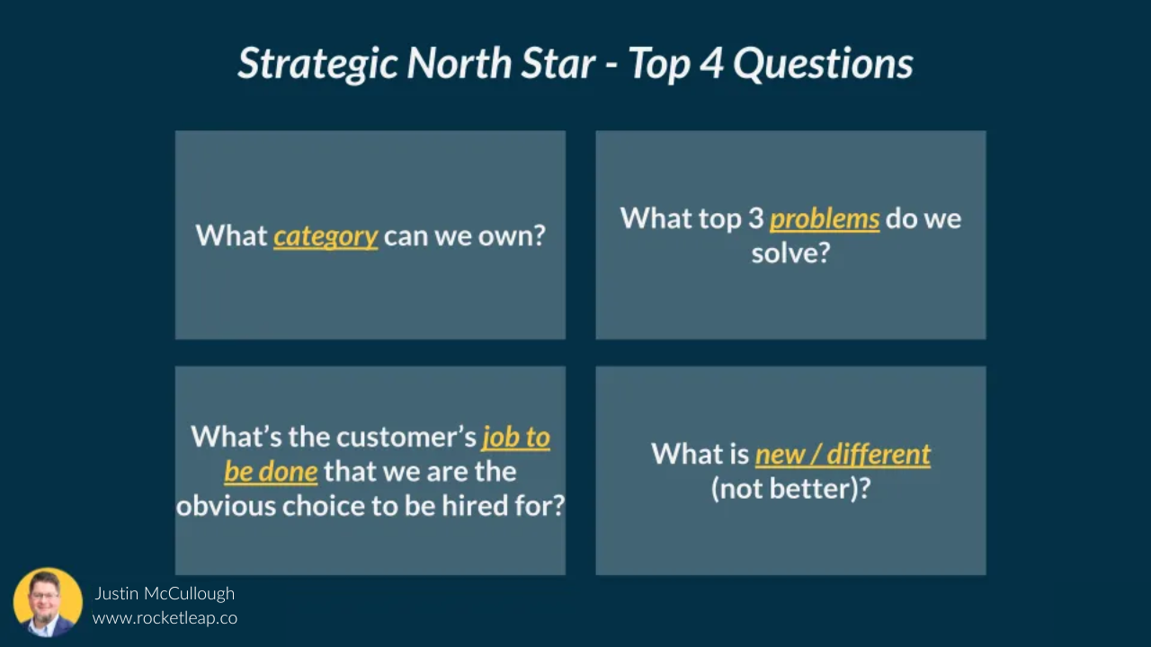 In this case we are looking at an early-stage company where branding, messaging, the offering, and customer acquisition model are very unclear. So these four questions on category, problem to solve, job to be done, and new/different help point us toward a bulls eye target that benefits all disciplines involved who have to create value that resonates with the ideal customer.